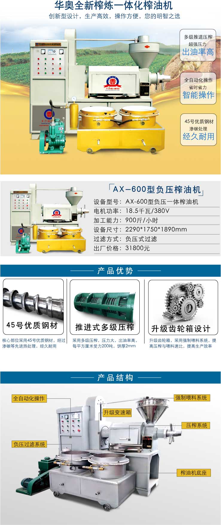 3、出油率高:螺旋榨油機壓榨,每平方厘米壓力可達200噸,出油率高。
