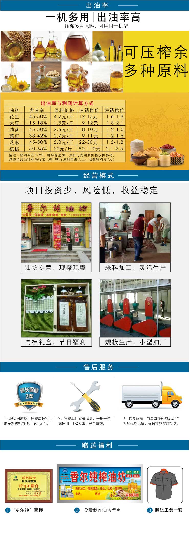 1、一機(jī)多用:榨油機(jī)可同時(shí)壓榨多種油料,如花生、大豆、菜籽、油葵、芝麻等;