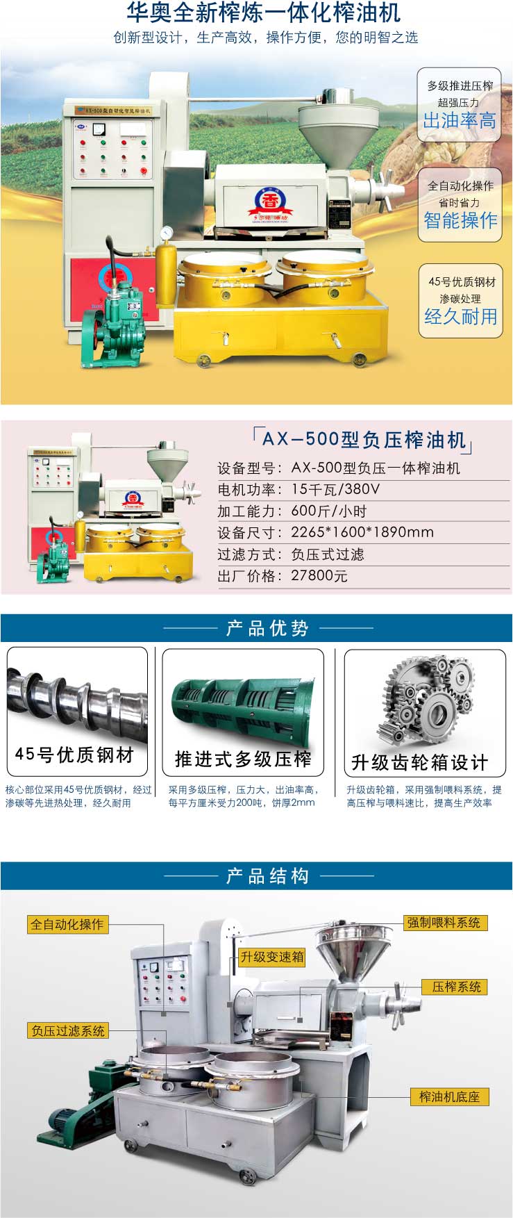 3、出油率高:螺旋榨油機(jī)壓榨,每平方厘米壓力可達(dá)200噸,出油率高。